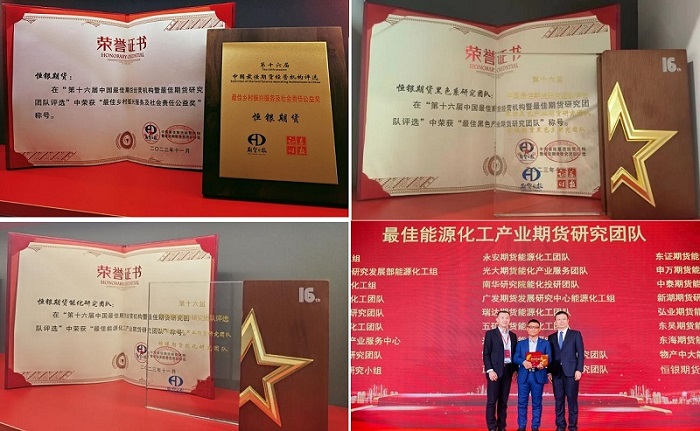 本屆評選于今年4月啟動,在歷時四個多月,經(jīng)過手機投票、專家評審等環(huán)節(jié),恒銀期貨最終榮獲“最佳能源化工產業(yè)期貨研究團隊”、“最佳黑色產業(yè)期貨研究團隊”以及“最佳鄉(xiāng)村振興服務及社會責任公益獎”。