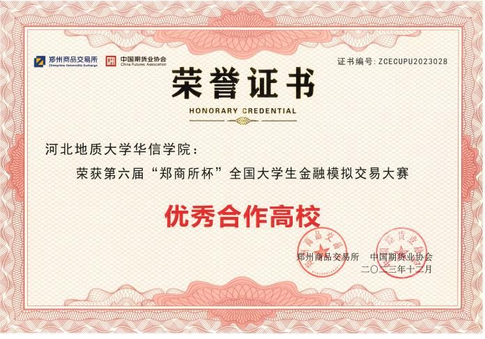 第六屆“鄭商所杯”全國(guó)大學(xué)生金融模擬交易大賽(簡(jiǎn)稱:第六屆“鄭商所杯”)已經(jīng)圓滿收官。近日,第六屆“鄭商所杯”獲獎(jiǎng)名單對(duì)外公示。國(guó)富農(nóng)業(yè)投資集團(tuán)所屬子公司恒銀期貨有限公司(簡(jiǎn)稱:恒銀期貨)對(duì)接的高校——河北地質(zhì)大學(xué)華信學(xué)院榮獲第六屆“鄭商所杯”全國(guó)大學(xué)生金融模擬交易大賽“優(yōu)秀合作高校”稱號(hào)。