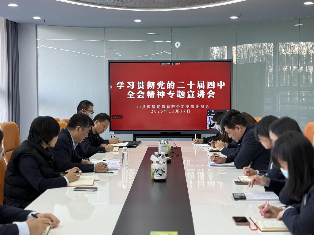 2025年11月27日,恒銀期貨有限公司在總部會議室設立主會場,召開學習貫徹黨的二十屆四中全會精神宣講報告會。河北國富投資副總經理、恒銀公司黨支部書記、董事長李剛作專題宣講,公司全體黨員和積極分子現場參會,公司外地黨員及從業人員通過線上會議同步學習。