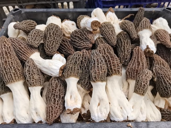 該基地占地25畝,初建有大棚27座。自去年11月播種以來,羊肚菌長勢良好,4月份已陸續(xù)開始出菇,種植戶們沉浸在羊肚菌收獲的喜悅之中,大棚內(nèi)一朵朵羊肚菌破土而出,乳白色的菌柄撐起蜂窩狀的菌蓋,煞是喜人。大家滿懷喜悅的采摘羊肚菌,去根、烘烤、挑選、打包,做著銷售前的準備,一片繁忙歡快的景象。