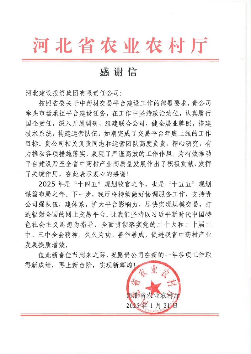 近日,河北省農(nóng)業(yè)農(nóng)村廳向河北建投集團(tuán)發(fā)來感謝信,高度贊揚(yáng)河北建投集團(tuán)在河北省中藥材交易平臺建設(shè)工作中所展現(xiàn)出的責(zé)任擔(dān)當(dāng)與卓越貢獻(xiàn)。